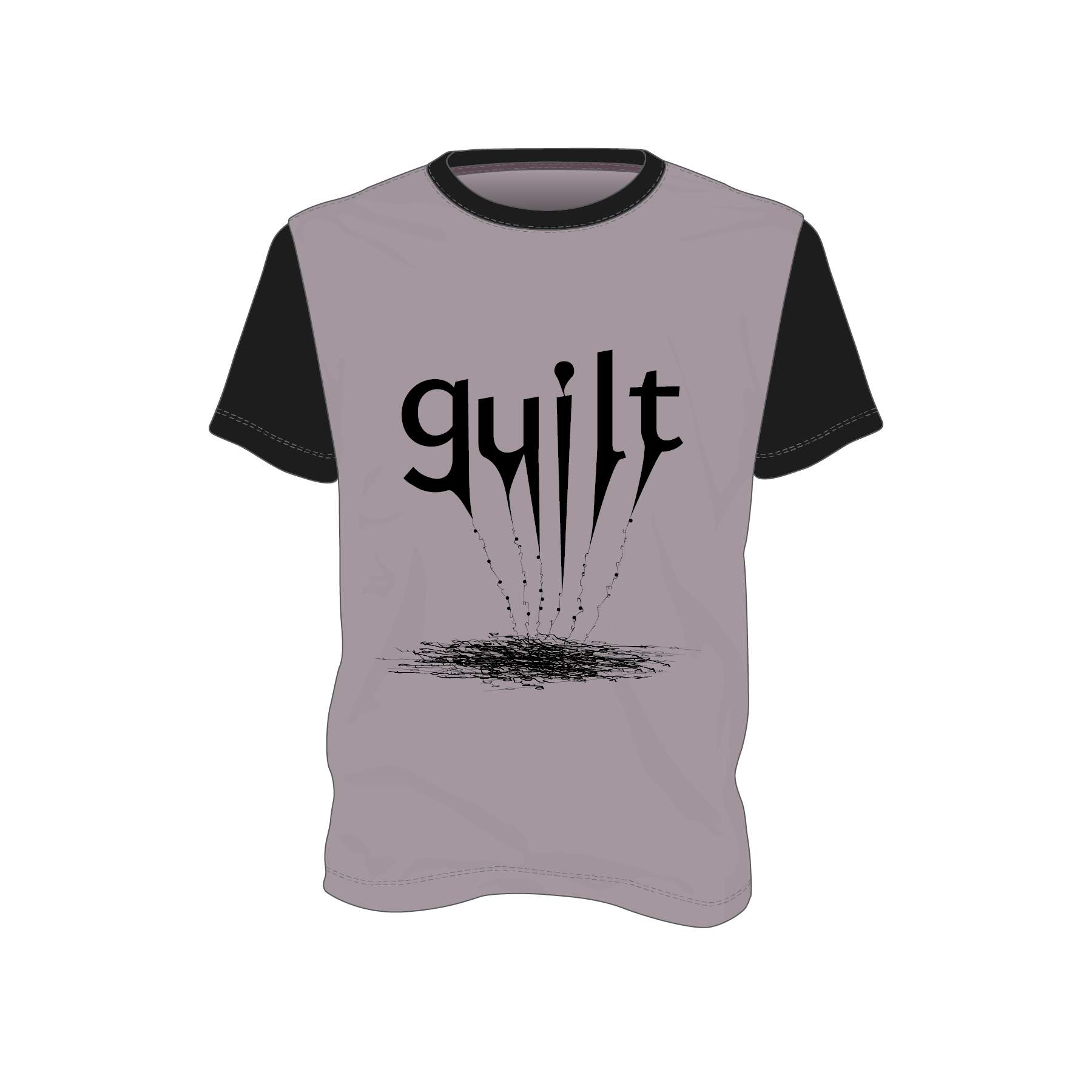 For this shirt, I wanted to visually express that feeling of the pit in your stomach. The pit is made up of different things that make me feel guilty.